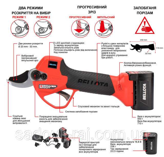 - Приблизний час роботи від одного акумулятора: 2-2,5 год / 4 000 зрізів (залежно від діаметра і твердості гілки)
